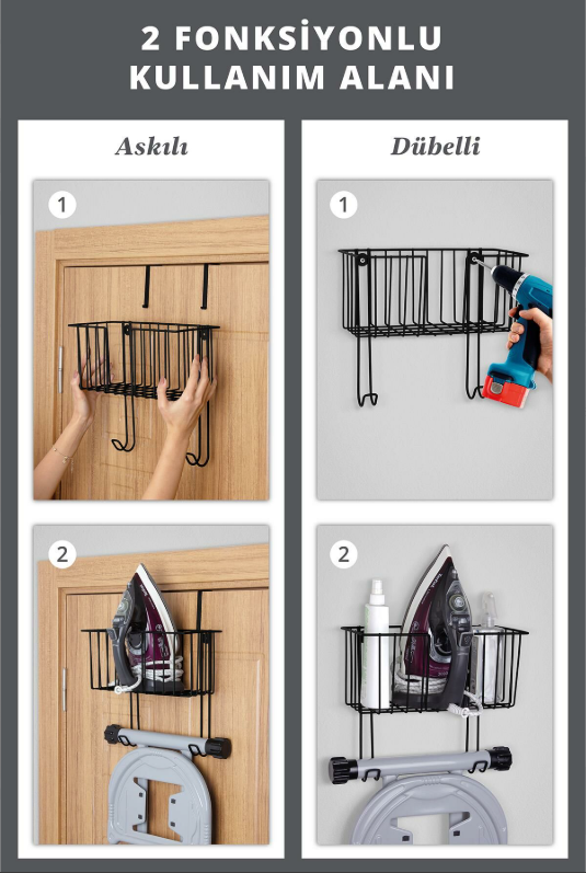 Duvara monte edebilir veya kapı arkasına asarak kullanabilirsiniz.